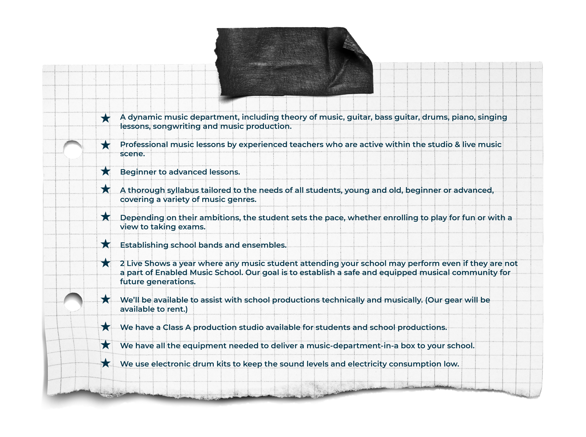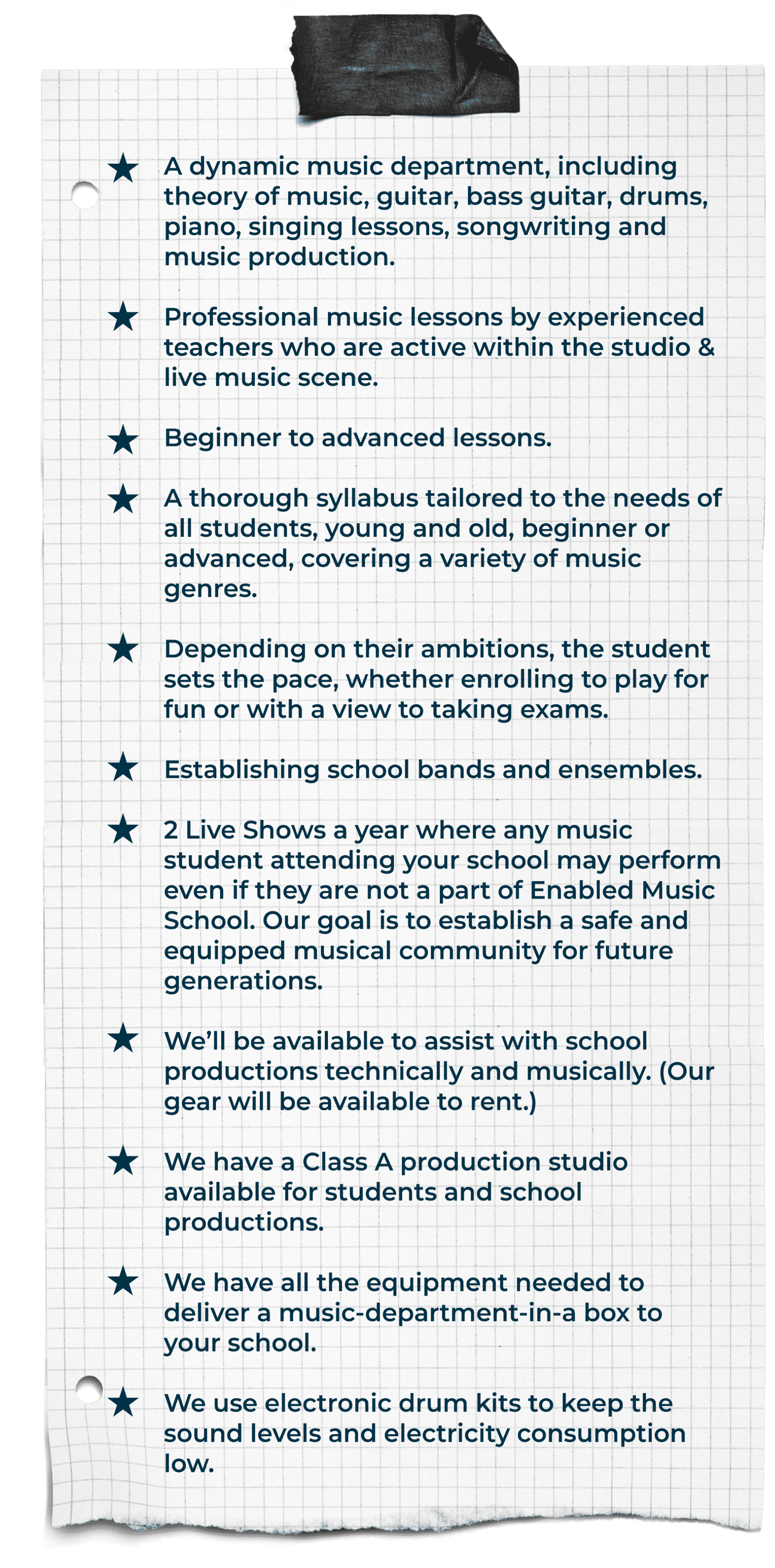 in the form of on-site lessons at your school, or off-site lessons at our studio.
